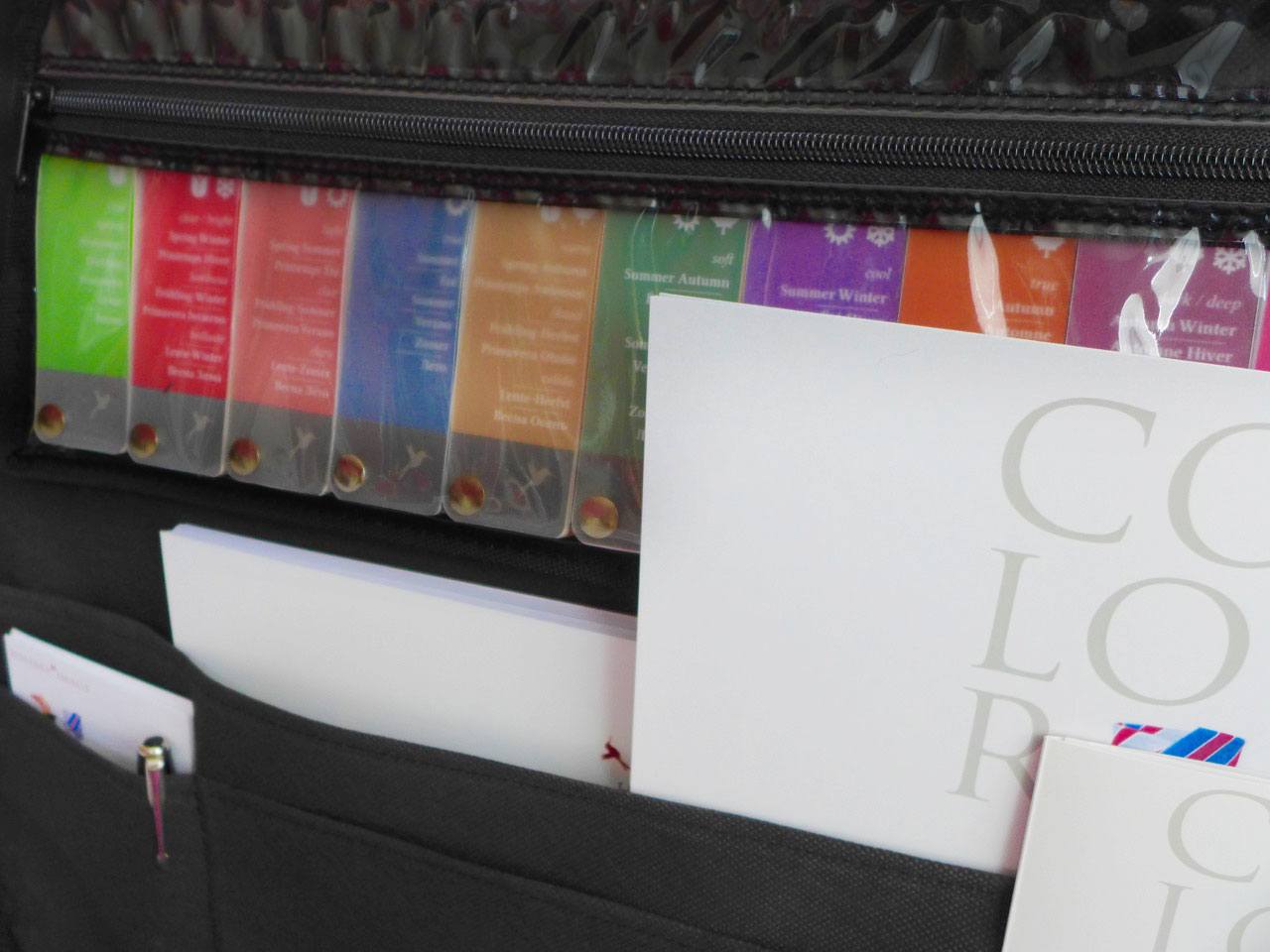 This tear-resistant, water-repellent polyester case fits everything you need for consultations: analysis drapes (folded to interior dimensions of max 18.9 x 14.2 in / 48 x 36 cm), style guides, colour swatches (e.g. our colour swatch fans), writing materials, tripod, extension cables, etc.