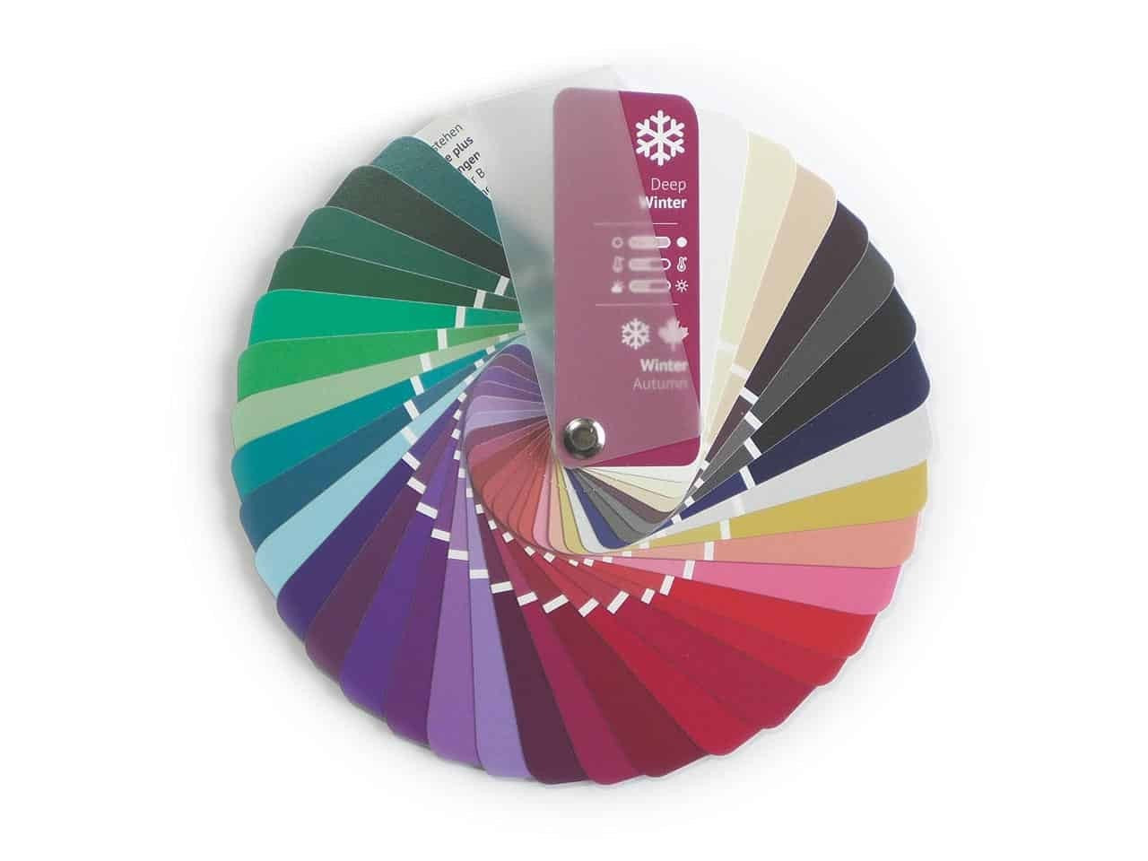 This professional colour palette fan is made of cardboard with a protective matte lamination and no mirror effect. It holds 35 colours with 3 brightness grades for Deep (dark) Winter, also known as winter-autumn in Europe.